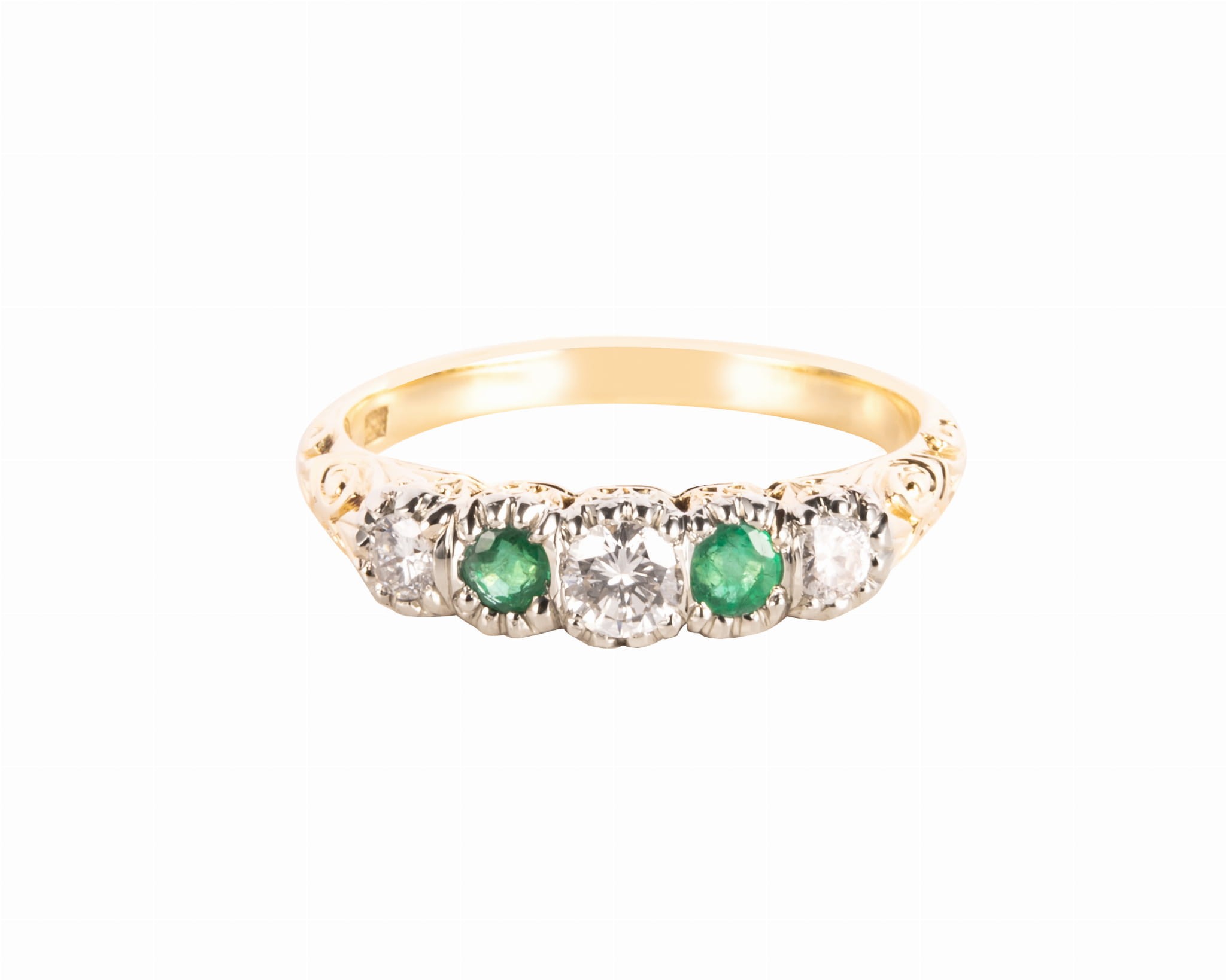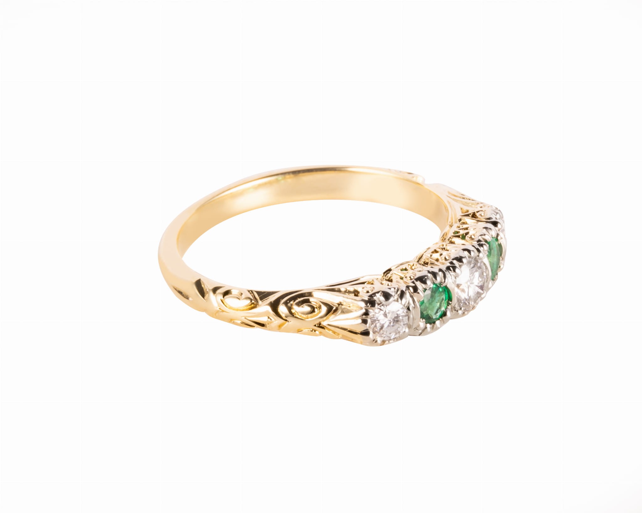 Pierścionek w żółtym złocie z 2 szmaragdami o łącznej masie ok. 0,18 karatów i 3 diamentami o masie ok. 0,35 karata. Diamenty mają czystość VS-Si i barwę E-F. Pierścionek ma dekoracyjnie zdobioną obrączkę. Całość wykonana w żółtym złocie próby 3, tj. 585. Rozmiar pierścionka to 15.