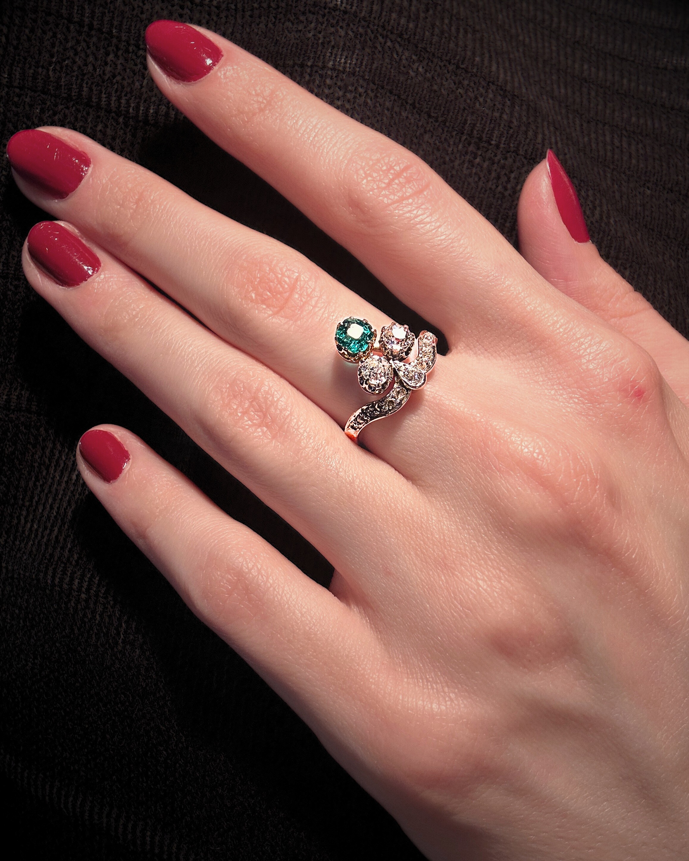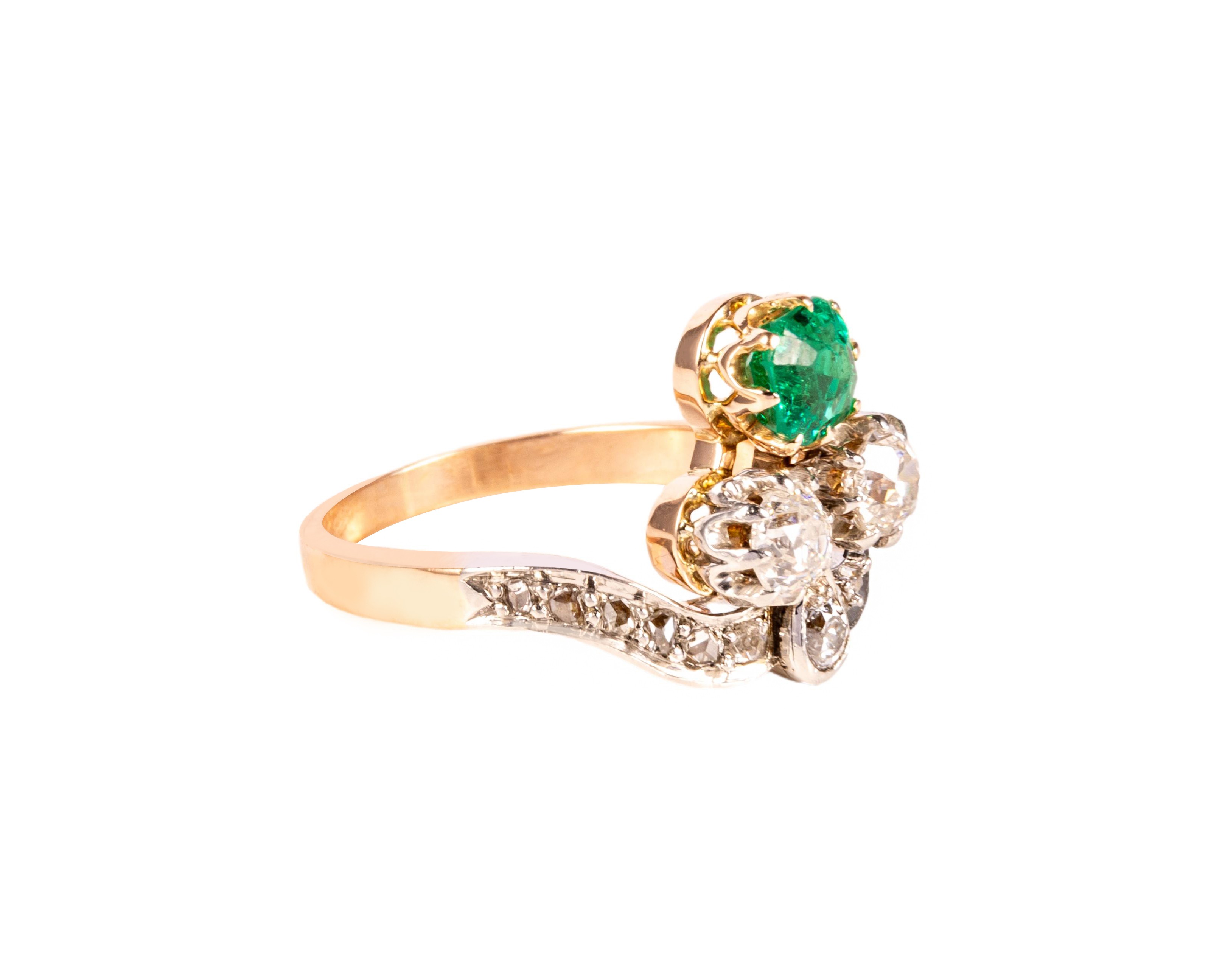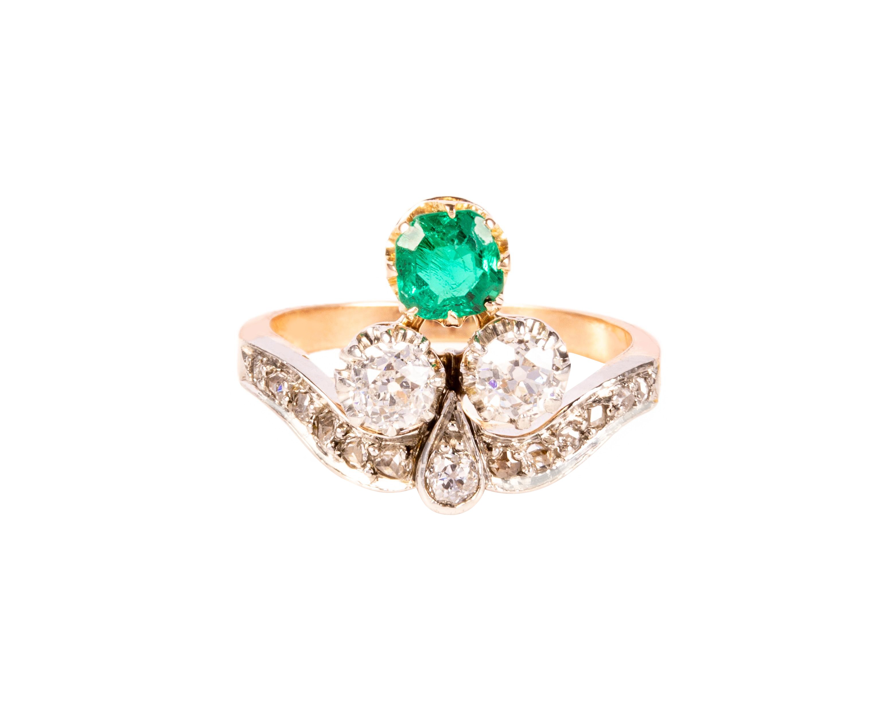Złoty pierścionek ze szmaragdem o masie ok. 0,40 karata i 2 brylantami w antycznym szlifie o łącznej masie ok. 0,50 karata, czystości VS i Si oraz barwie H i G. Masa pozostałych 13 diamentów zakutych w obrączce pierścionka to ok. 0,10 karata. Całość wykonana ze złota próby 585-750 oraz platyny próby 950, na rozmiar 12.