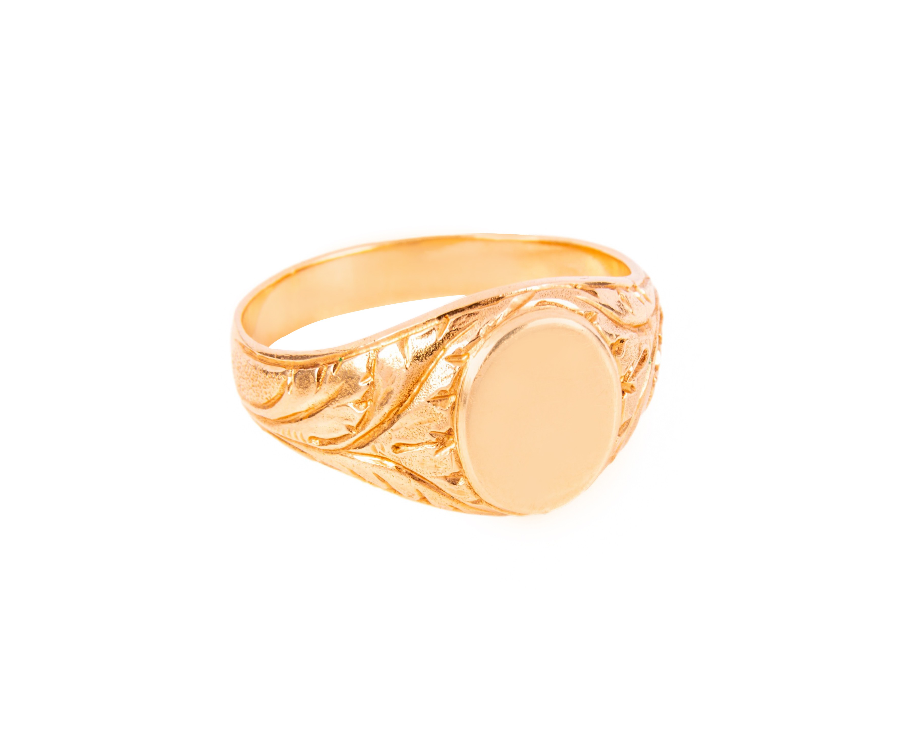 Sygnet wykonany z żółtego złota próby 585, ze zdobieniami na bokach - grawerowane liście. Sygnet ma rozmiar 26.