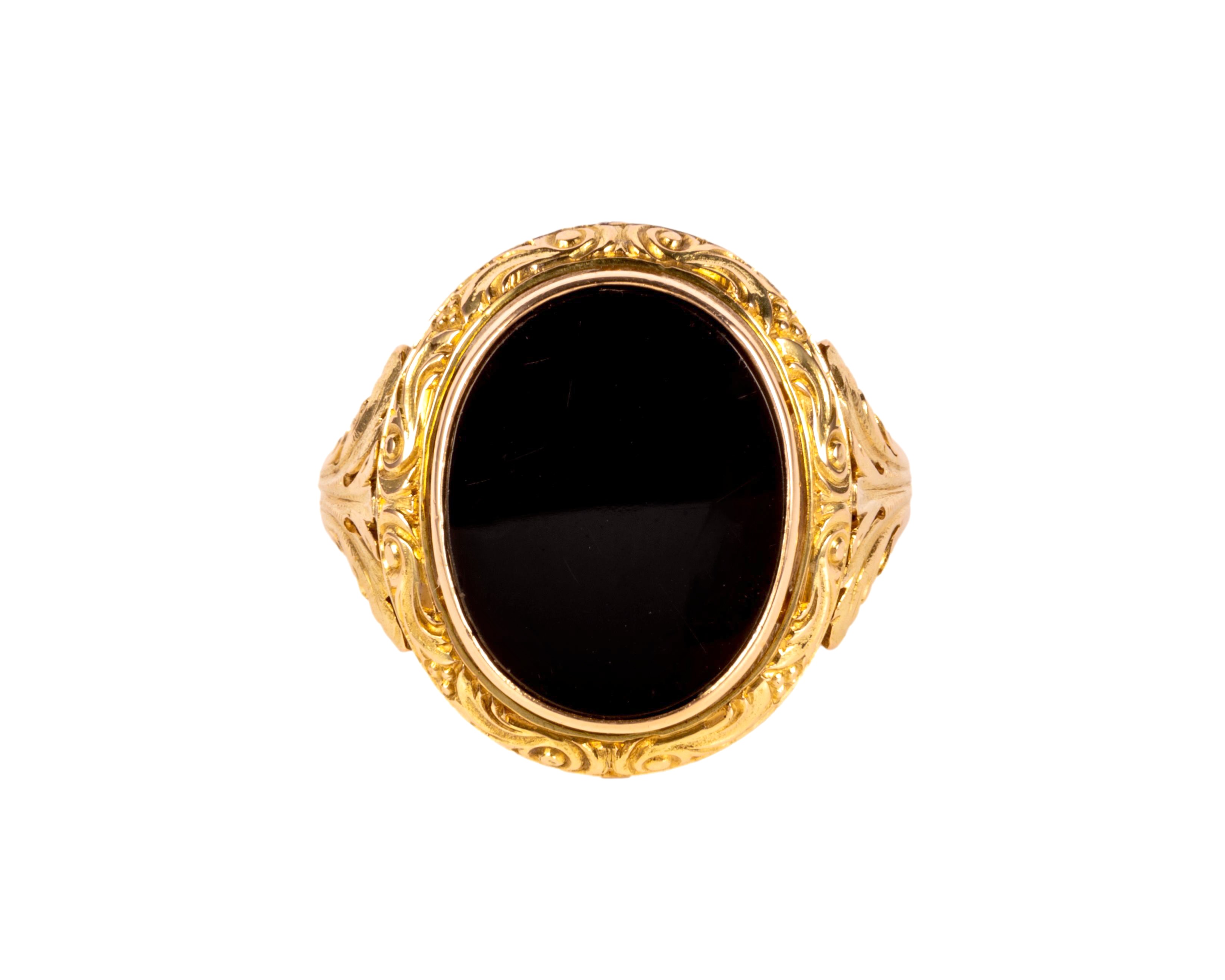 Złoty sygnet z owalnym onyksem i zdobieniami