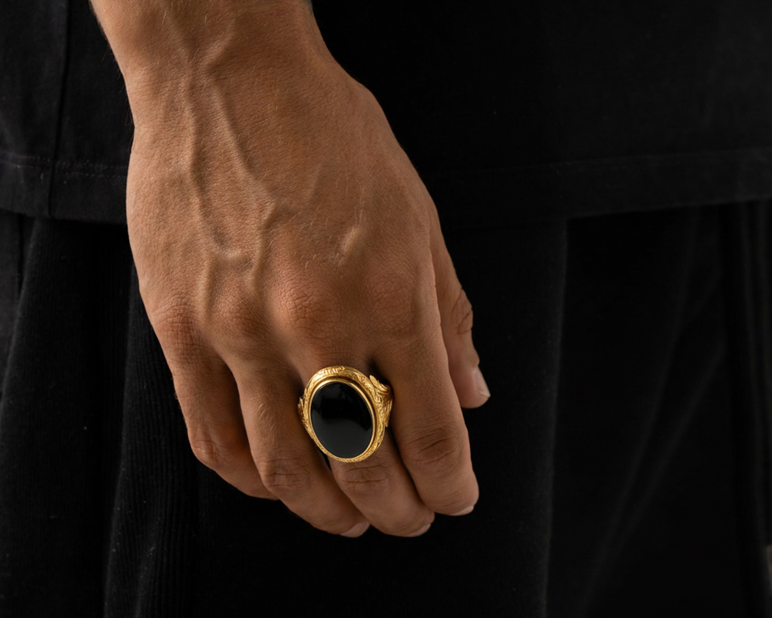 Centralnym elementem sygnetu jest owalny onyks – kamień symbol siły, ochrony i męskiej energii. Jego głęboka, intensywna czerń pięknie kontrastuje z ciepłym blaskiem żółtego złota, tworząc klasyczną, wyrazistą kompozycję. Oprawa kamienia została dekoracyjnie wygrawerowana, co nadaje sygnetowi artystycznego charakteru i świadczy o kunsztownym wykonaniu.
